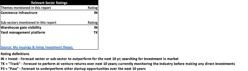 Warehouse Dock Door and Gate Visibility tools 👀 (Invest): Warehouse operators could desperately use a full-stack (hardware, AI/ML capabilities, UI with data reporting) vision-based gate visibility solution (Navtrac, Kargo, e.g.). The technology will identify and extract relevant data points from what types of commercial vehicles enter and leave an industrial facility. This data will be used for ISR compliance and help to improve operations.