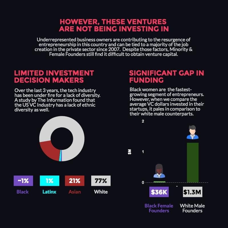 I was able to find data on each of these issues but of course, I couldn’t simply share these findings through bullets — I had to do something more creative (for some reason). I wanted to create something that captured my thought process as I read these various articles and reports — that’s right, I created an infographic. You can find the final version here but below are the four separate section of my infographic entitled “It Doesn’t Add Up: Why Underrepresented Entrepreneurs should Receive more Investment Capital.” Please feel free to provide me with feedback or suggested research reports in the comments section!