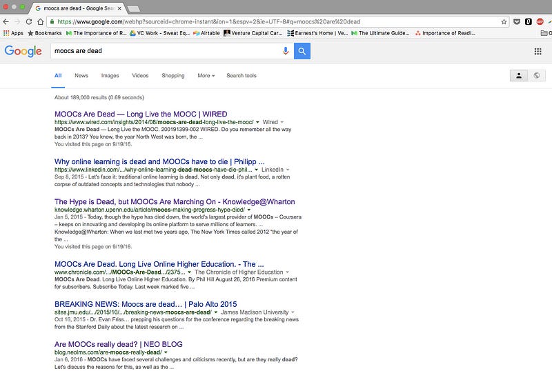 But it’s 2016 and the revolution wasn’t televised or streamed. Students are still applying and enrolling into colleges. During my research, I Googled “MOOCs are dead” and got the results below. Since 2013, there seems to be a consensus that there isn’t a consensus of whether MOOCs are dead or alive or a zombie hybrid.